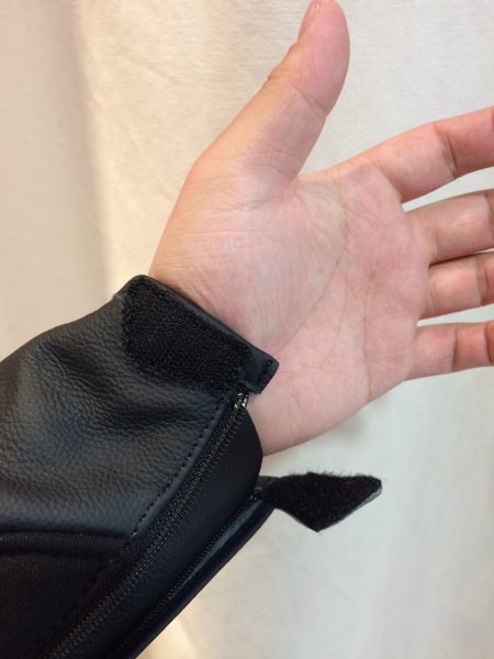 ③最後にグローブのマジックテープを止め、袖のファスナーを上げます。