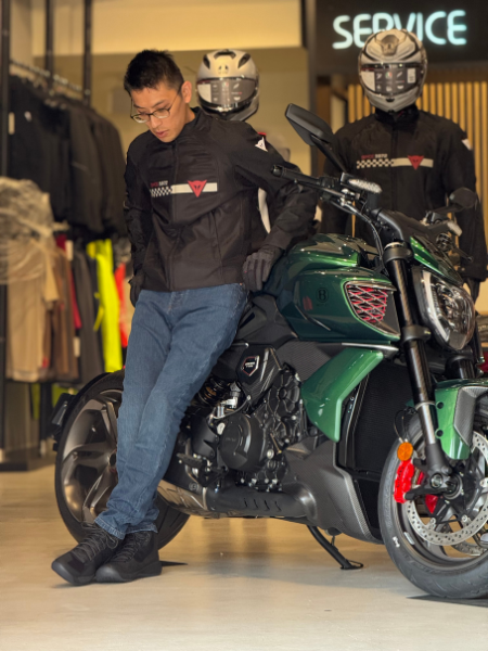 バイクの持つ圧倒的な存在感を引き立てるため、全体的にシック&ライトテイストでコーディネート。
