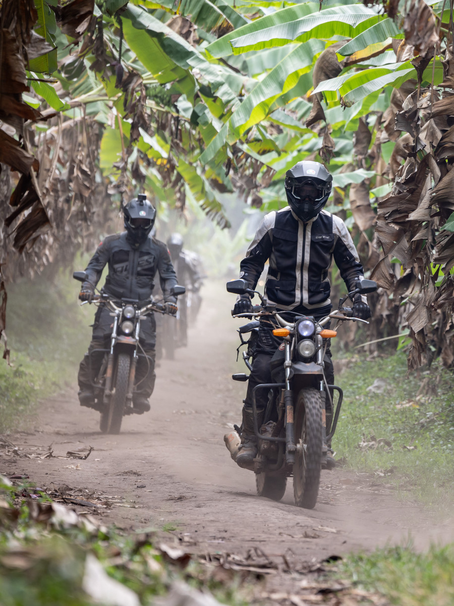 雨が降ると、道は本格的な技量テストへと変わり、泥が車輪をのみ込み、バイクを重くします。それでも、困難の先には、忘れがたい現地の人々との出会いが待っています。