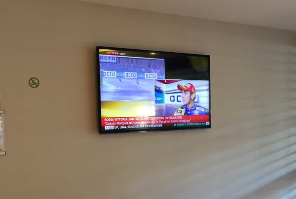 ホテルのロビーではイギリスGPでのロッシ優勝のニュースが流れておりました。