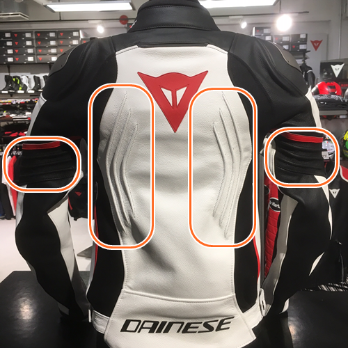 腰・腕の3本のラインは、DAINESE特許の伸縮材"Microelastic 2.0"というもので、
