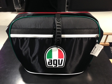 AGVのロゴ入りヘルメットバッグ。フルフェイスヘルメットがすっぽり入る十分な容量。