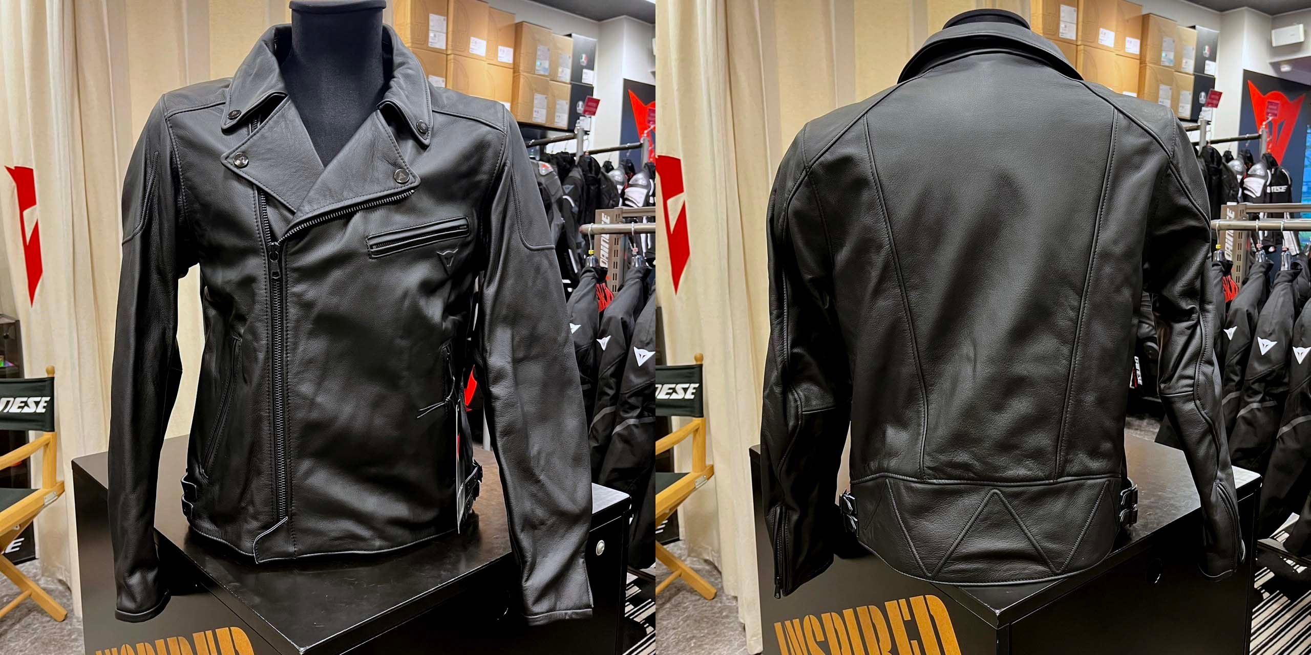 ダブルブレスト構造とシャツカラーを特徴とするクラシックなバイカージャケット。