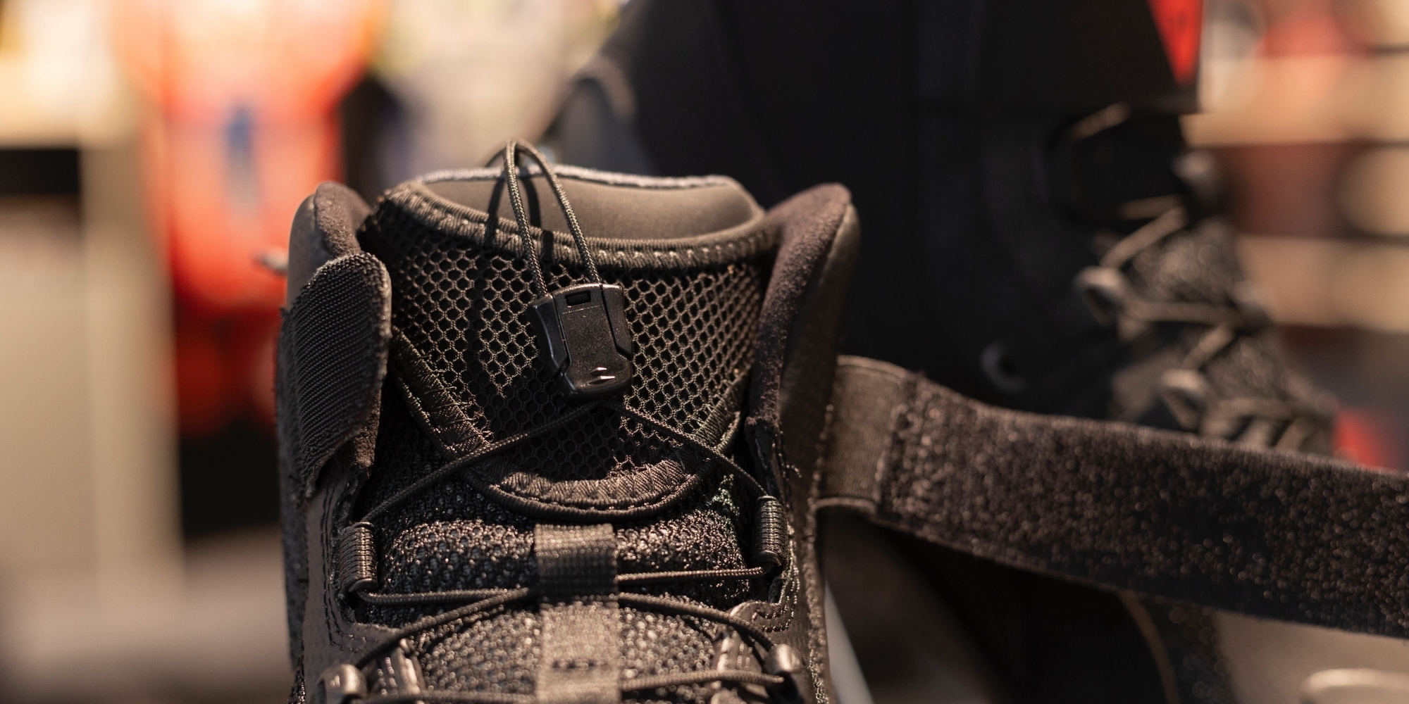 Quicklace System(クイックレース) とベルクロのフィット調整機能が搭載されており、素早く脱ぎ履きでき、フィット感の調整もスムーズにできます。縛ったひもはシュータン上部のポケットに収納することで、靴紐があばれず、安全性が向上し、見た目もスマートになります。