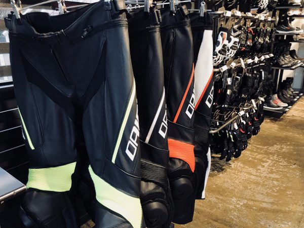 ブーツインシステム対応、新形状のニースライダーを備えたスポーツタイプのレザーパンツ。